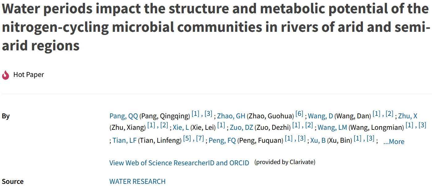 亮点:干旱和半干旱地区不同水期下的盐度变化对氮的微生物代谢过程的影响鲜有报道。在枯水期,以NO3−为主的无机氮占据主导地位;在丰水期,盐度高于其他水期。功能基因的丰度随着水量的减少而增加,氮浓度由各种特定的基因组决定。携带这些基因的细菌的相对丰度总体表现为丰水期最低而枯水期最高,在不同水期中差异显著。此外,SO42−是反硝化、DNRA和ANRA微生物群落的最强预测因子。庞晴晴作为第一作者的相关研究发表在环境科学领域国际顶级期刊Water Research,并入选ESI热点论文。