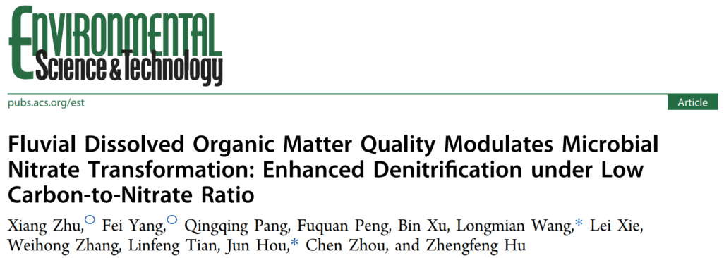 亮点:现有的化学计量模型表明低DOC/NO3−会抑制反硝化作用,但我们针对我国西北典型河流的研究结果显示,低DOC/NO3−组中反硝化基因的中位丰度最高,其次是中组和高组。同位素分析也证实低组中反硝化是主要过程。增强的反硝化作用与溶解性有机质(DOM)中较高比例富里酸有关。室内实验进一步表明,富含富里酸的DOM即使在低DOC/NO3−条件下也能作为高效的碳源,增强硝酸盐还原酶和一氧化氮还原酶活性。朱翔作为第一作者的相关研究发表在环境科学领域国际顶级期刊Environmental Science & Technology。