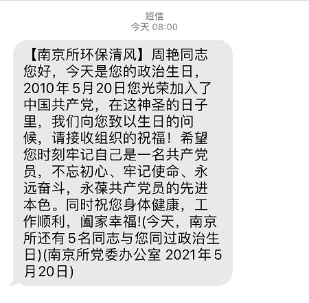 “一条简单的政治生日短信为今天增添了不一样的光彩,让我感受到了党组织的关怀,激荡起我被党组织接纳那天时的热血澎湃,回忆了我的入党初心,我会以最强的使命担当和最实的工作干劲在平凡的岗位上绽放党性光芒。”土壤中心周艳同志收到短信后激动地分享至朋友圈。