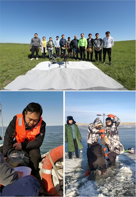 图为呼伦湖无人机草原调查及湖上采样工作照