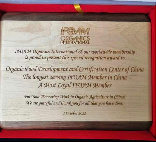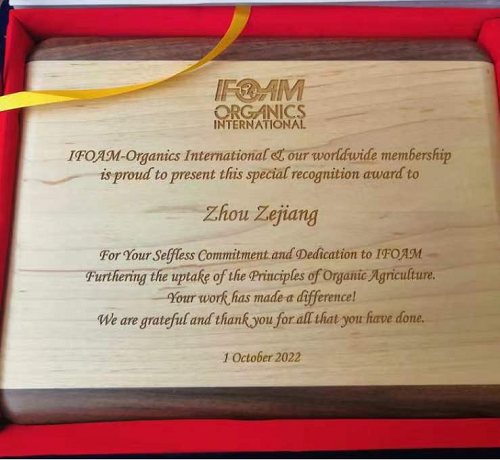 (给有机中心周泽江研究员颁发的“IFOAM突出成就奖”)